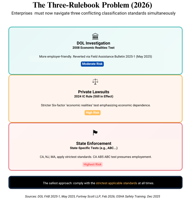 This means enterprises now face three simultaneous and conflicting standards: DOL investigations use the 2008 test; private lawsuits use the 2024 economic realities test; and state enforcement uses state-specific tests that are often the most aggressive. The result is regulatory limbo, where the safest approach is to comply with the strictest applicable standard at all times.